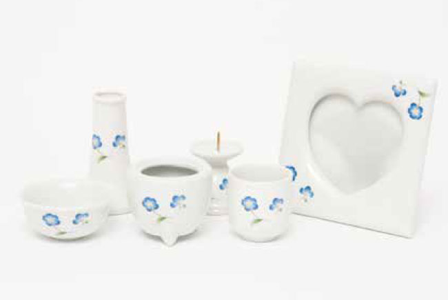 お線香を横置きできるから安心して使える香皿と、ペットちゃんが飲む姿を考えて作られたお水入れ、ご飯が食べやすいように少し高めの台になった供物皿、シンプルな作りの花立、ろうそく立ての基本5点セット+遺影を飾れる写真立てをご用意しました。