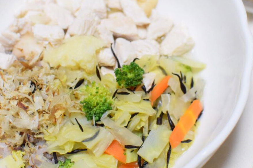 茹でた鶏むね肉&ニンジン、白菜、ブロッコリー、ヒジキ、ショウガのスープかけゴハンに、煮干しの削り節と摩り下ろしニンニクをトッピングU^ェ^U